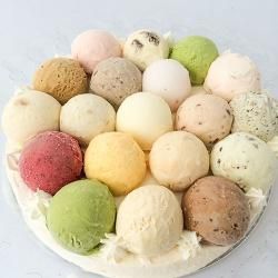 丸いバニラアイスクリームのベースの上に、ぎっしり並んだ19個のプチアイスクリーム&シャーベット。